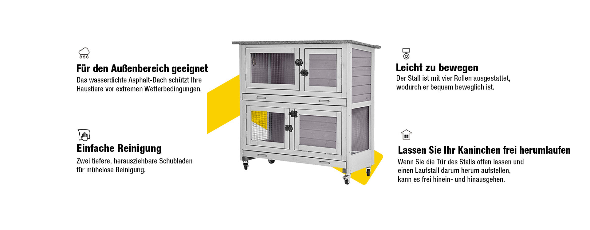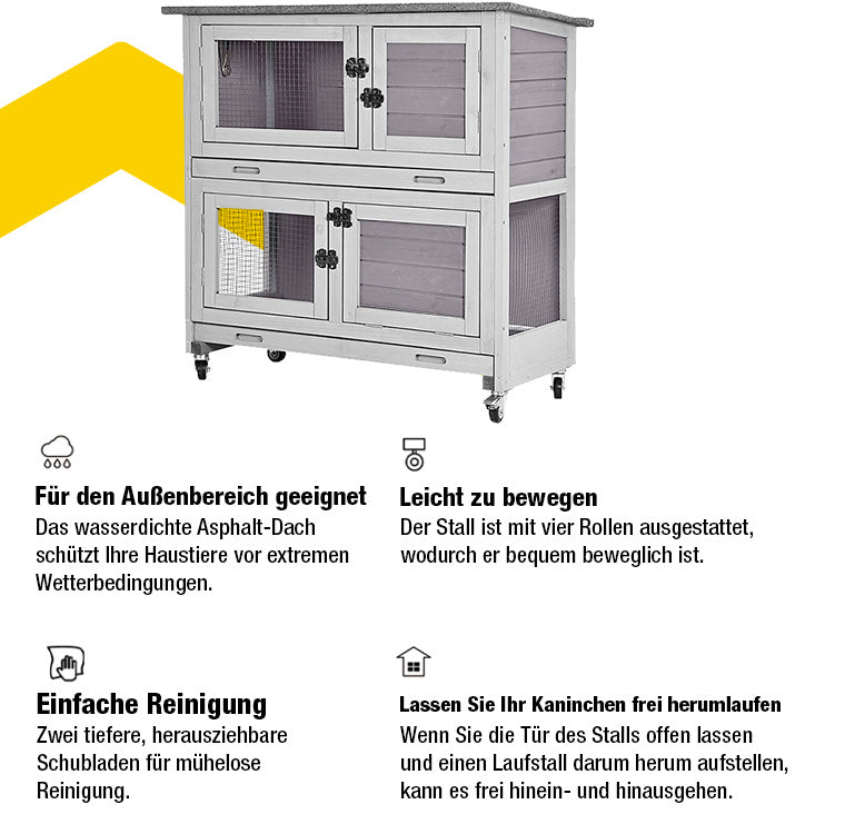 Wir unterstützen den freien Auslauf von Kaninchen, aber nicht jeder kann sich ein ganzes Zimmer für ein Kaninchen leisten. Ein Kaninchenstall bietet ihnen einen Ort, an dem sie schlafen, essen, trinken und entspannen können.