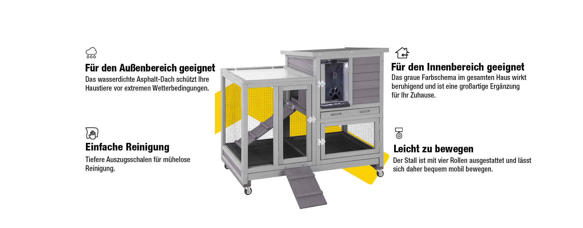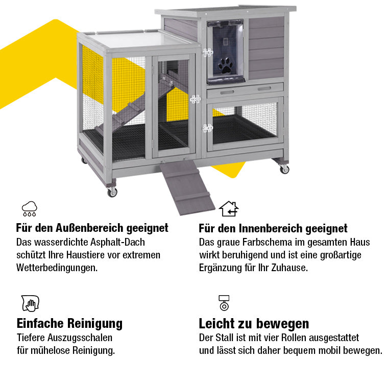 - Dank der Schiebetür zur Trennung von oberen und unteren Etagen ist der Stall leicht zu reinigen. Abnehmbare PVC-Vorhänge und eine kleine Rampe vor der Tür sorgen für ein gemütliches Zuhause für Ihr Kaninchen.